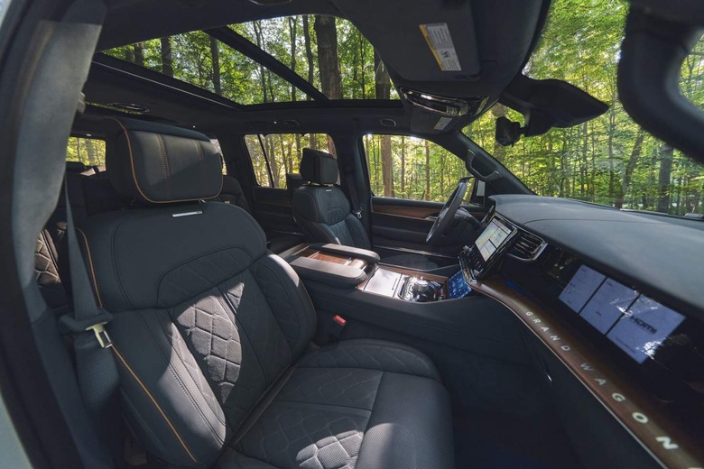 Handily, Jeep doesn't forget the essentials in its push upmarket. All three rows are adult-scale, and there's less of the sense that the rearmost seats are the consolation prize. Legroom and headroom is plentiful, and all three rows can have electric adjustment. The Grand Wagoneer will come in two configurations, either an eight-seater with a second-row bench, or a seven-seater with captain's chairs there instead and storage in-between. Vents, cubbies, and USB ports abound, though those at the very back will need to bring their own screens as Jeep's entertainment package doesn't stretch that far.