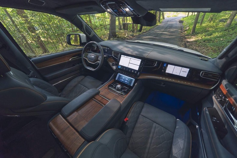 Similarly neat touches abound. The lower center touchscreen powers out of the way, for example, revealing a hidden storage nook with Qi wireless charger. The infotainment system's knobs are the same design that McIntosh – Jeep's audio partner – uses on its standalone amps. A cooled bin hides in the center console, and there's optional lockable storage there too.