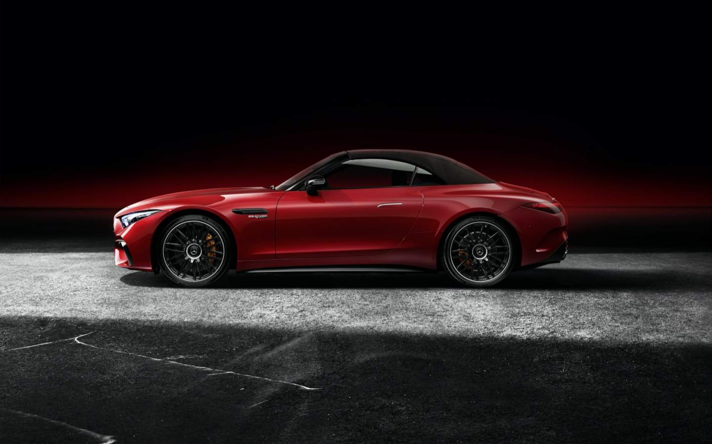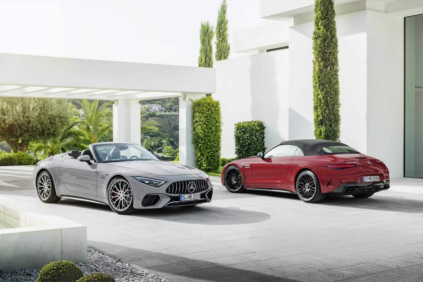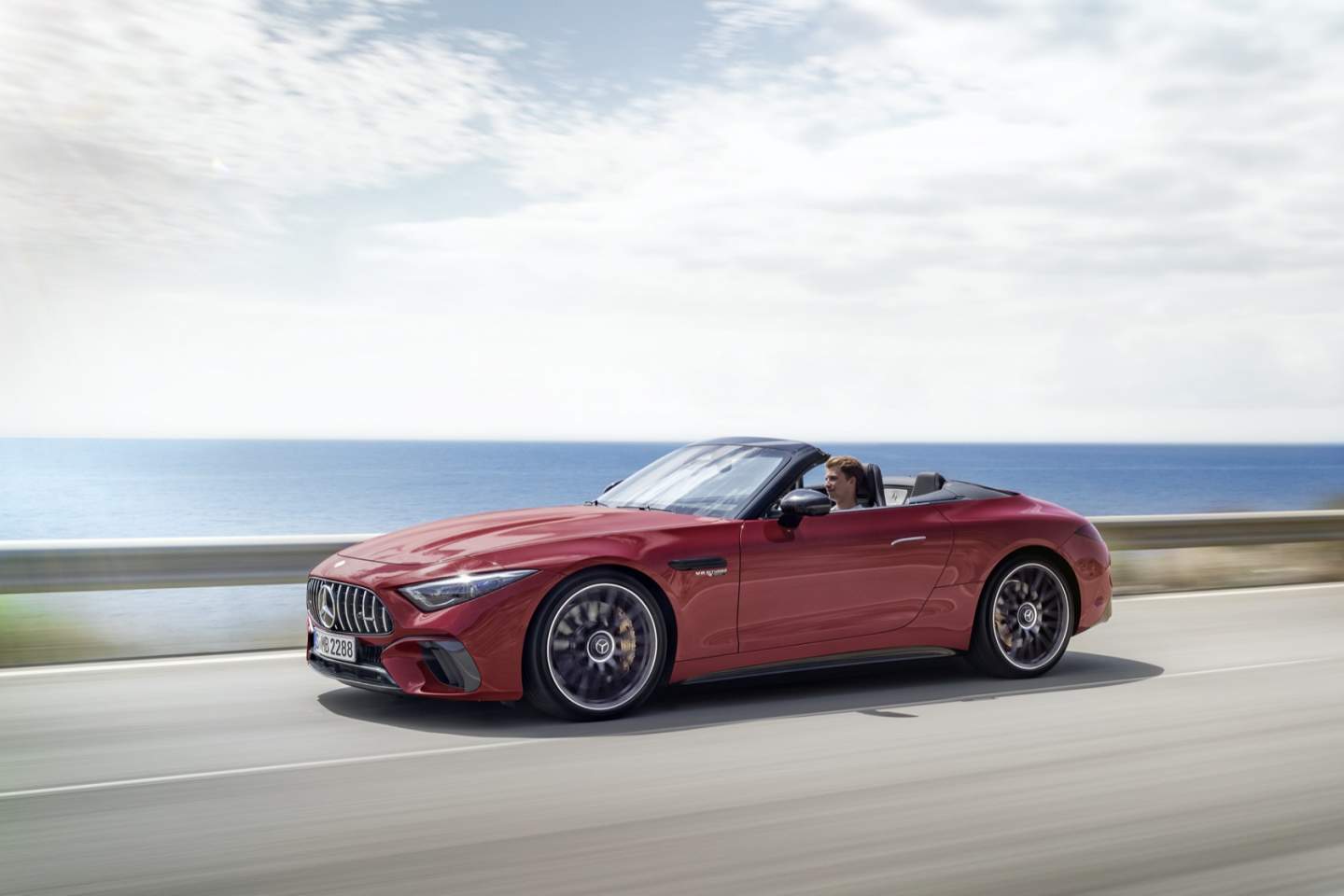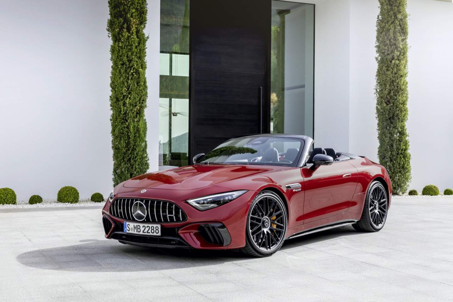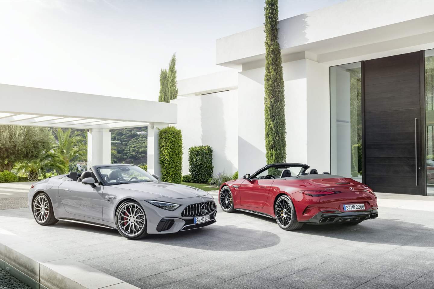In the 2022 AMG SL 55 that's tuned for 469 hp and 516 lb-ft of torque, enough for 0 to 60 mph in an estimated 3.8 seconds. The 2022 AMG SL 63 upgrades those numbers to 577 hp and 590 lb-ft of torque, trimming the 0-60 mph time to an estimated 3.5 seconds. For the first time in SL history, AMG will be using AMG Performance 4MATIC+ all-wheel drive, too.