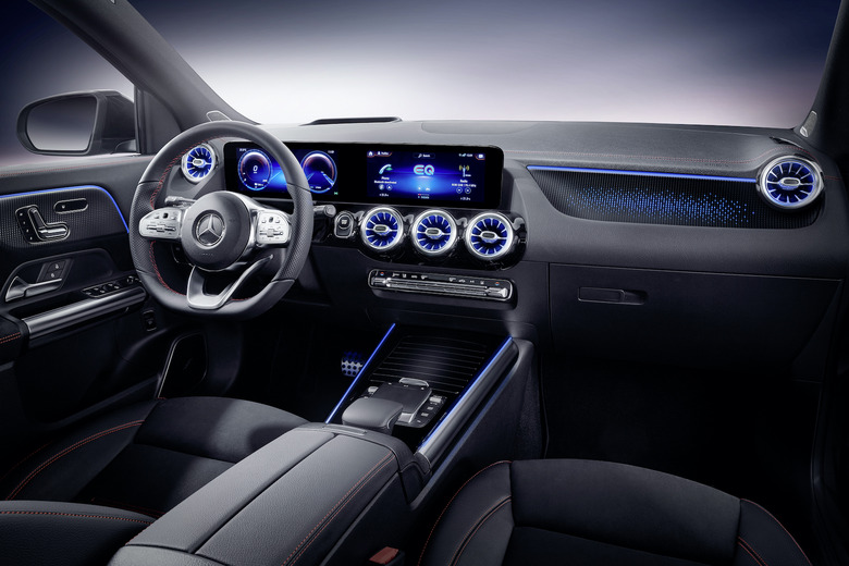 Inside, Mercedes' MBUX infotainment system will be standard – though sadly not the MBUX Hyperscreen coming to the EQS luxury electric sedan – with voice control and including navigation as standard with special EV-focused features. That'll show things like charging options, route-planning that takes into account charging times and stops to plug in, and topography and weather along a planned journey that could have an impact on how much driving you can squeeze out of a charge. It'll also take into account traffic and how individual drivers are behind the wheel.