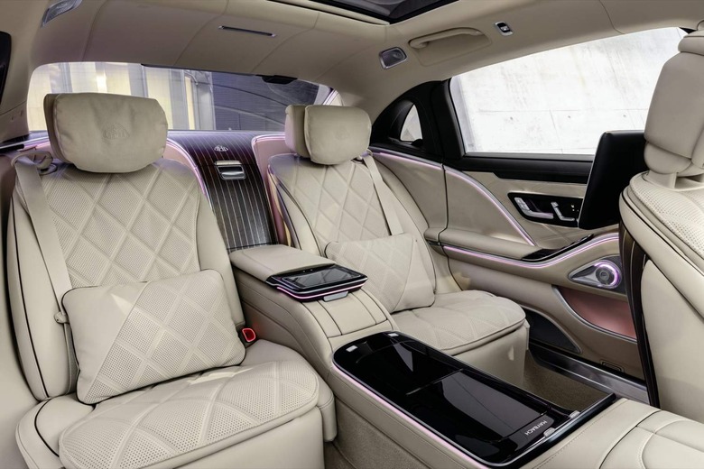 A new "Maybach" drive mode in the Dynamic Select system delivers what Mercedes describes as "maximum ride comfort and smooth acceleration" to tap that power and traction without spilling the drinks in the rear. Speaking of, there's the option of silver-plated champagne flutes and a refrigerated compartment back there, with matching holders in the center console to keep the drinks upright.