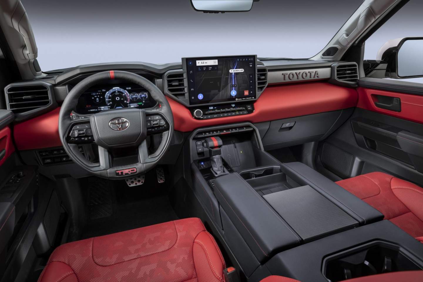Inside, the 2022 Tundra is the first Toyota vehicle to debut an all-new infotainment system wholly developed by Toyota's Connected Technologies department in Texas. It now has a human-machine interface via voice commands and five times more processing power than the previous system. An 8-inch touchscreen is standard, while a 14-inch touchscreen display is optional, with wireless Apple CarPlay and Android Auto standard across the board.