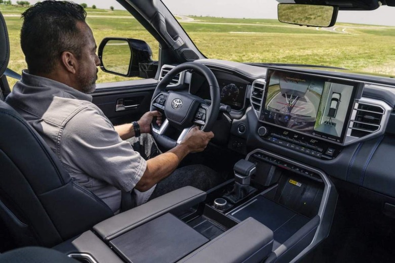 Inside, the 2022 Tundra is the first Toyota vehicle to debut an all-new infotainment system wholly developed by Toyota's Connected Technologies department in Texas. It now has a human-machine interface via voice commands and five times more processing power than the previous system. An 8-inch touchscreen is standard, while a 14-inch touchscreen display is optional, with wireless Apple CarPlay and Android Auto standard across the board.