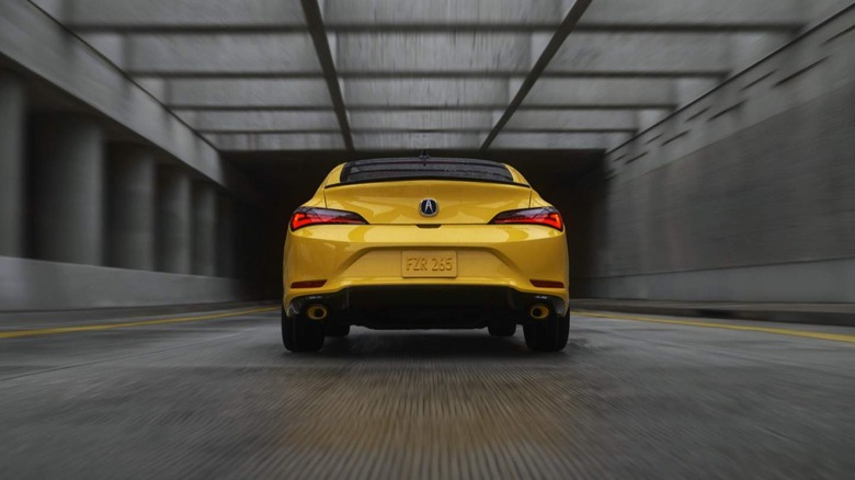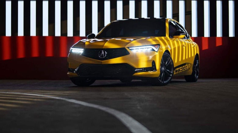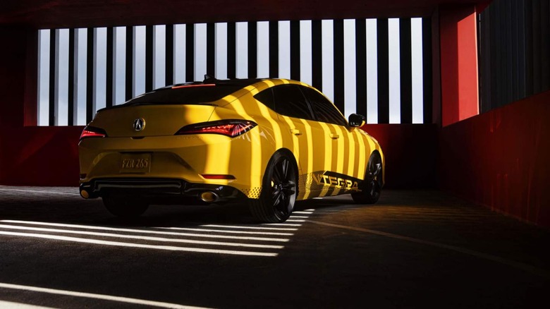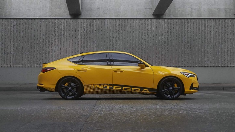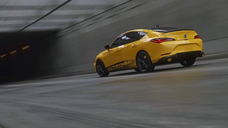 The calipers for those are finished in Indy Yellow, to match the Indy Yellow Pearl paint job that Acura selected for the Integra Prototype. Borrowed from the NSX's paint catalog it's a nod, the automaker points out, to the Phoenix Yellow hue that was offered on the 2000-2001 Integra Type R. Alongside it are Berlina Black accents with a high-gloss finish, across the roof, decklid spoiler, mirror caps, rear diffuser, and front grille. Integra decals run across the lower sills.