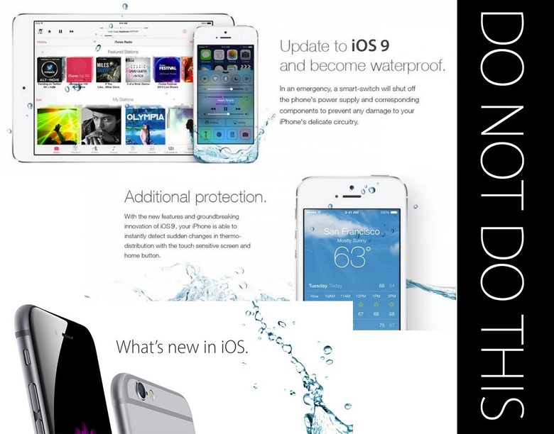 Fast forward to 2015 and we've seen the same images again, spreading just this week through Facebook, Twitter, and the like. You'll notice a couple of shoddily photoshopped iOS 9 additions here – otherwise they're the same as they were originally – as well as a new shot of the iPhone 6s with a tiny splash of water to drive the point home.