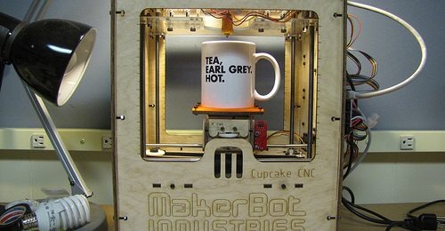 If 3D printing advances as fast as 2D printing advanced, we'll be working with our own Replicators from Star Trek by the year 2080. It took just 40 years for the original printing press to turn over from the single Gutenberg press to get to a mass production scale across Europe, and much, much less time for computers to advance from massive machines to teeny-tiny chips. With advances like home-bound do it yourself printers and the fact that pirate sites across the web are now sharing model files so that you might print your own objects at home without effort, we've not got much time at all before advances are made to the tune of Earl Gray, Hot.