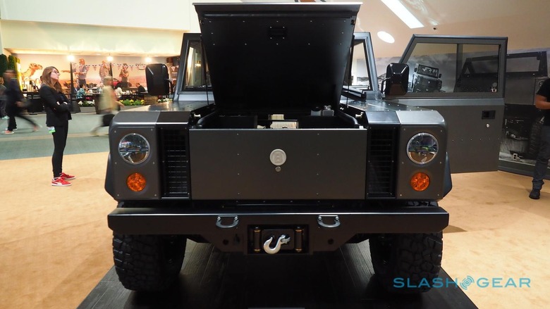 Truck fans will be relieved to see electronic locking differentials front and rear, and 2-speed HI/LO range gearboxes. In LO mode, there's 4x torque multiplication for heavy-duty work (and a 32 mph top speed). The B1 can tow 6,000 pounds and has a 6,000 pound payload capacity; on the front there's a 12,000 pound hydraulic winch, with a 125 foot lead.