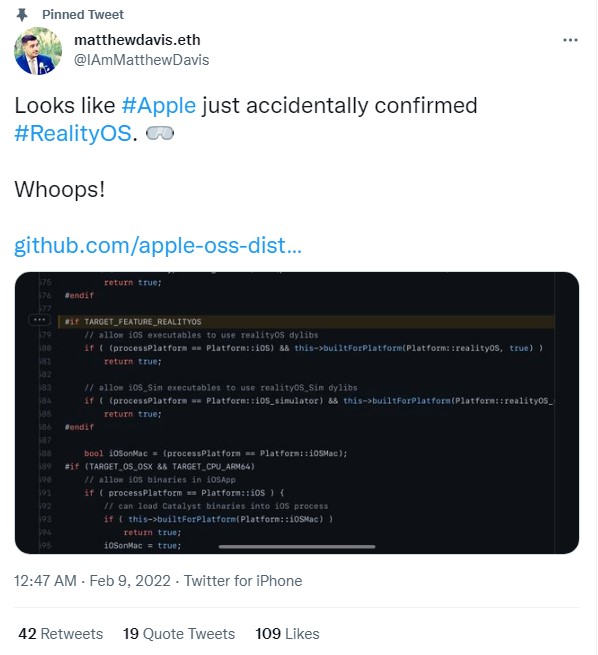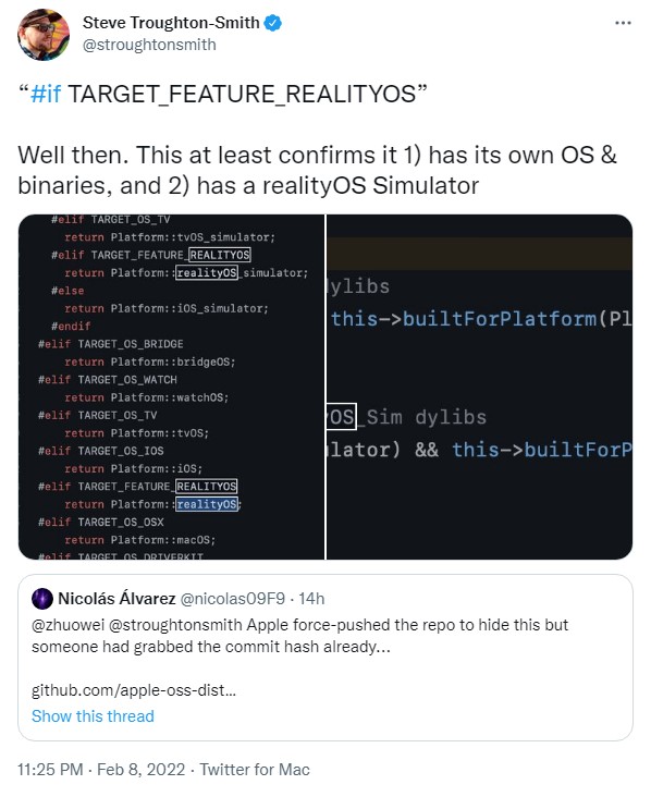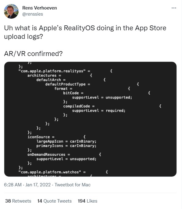 Developer Rens Verhoeven shared the references he discovered in App Store upload logs, asking, "Uh what is Apple's RealityOS doing in the App Store upload logs? AR/VR confirmed?" That seems to be the question that's on everyone's minds at the moment, Rens.