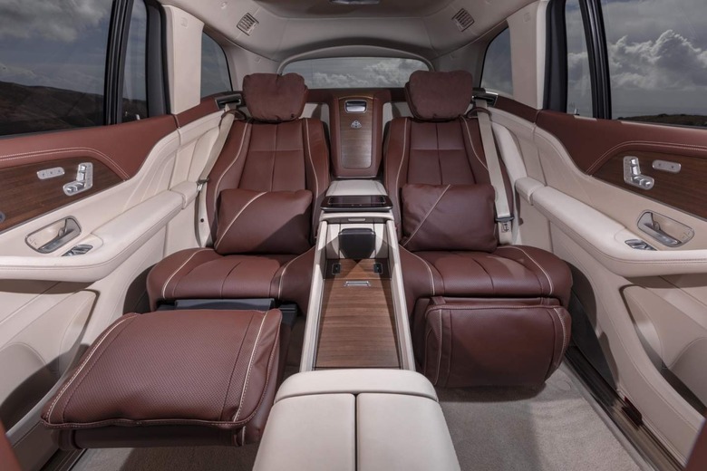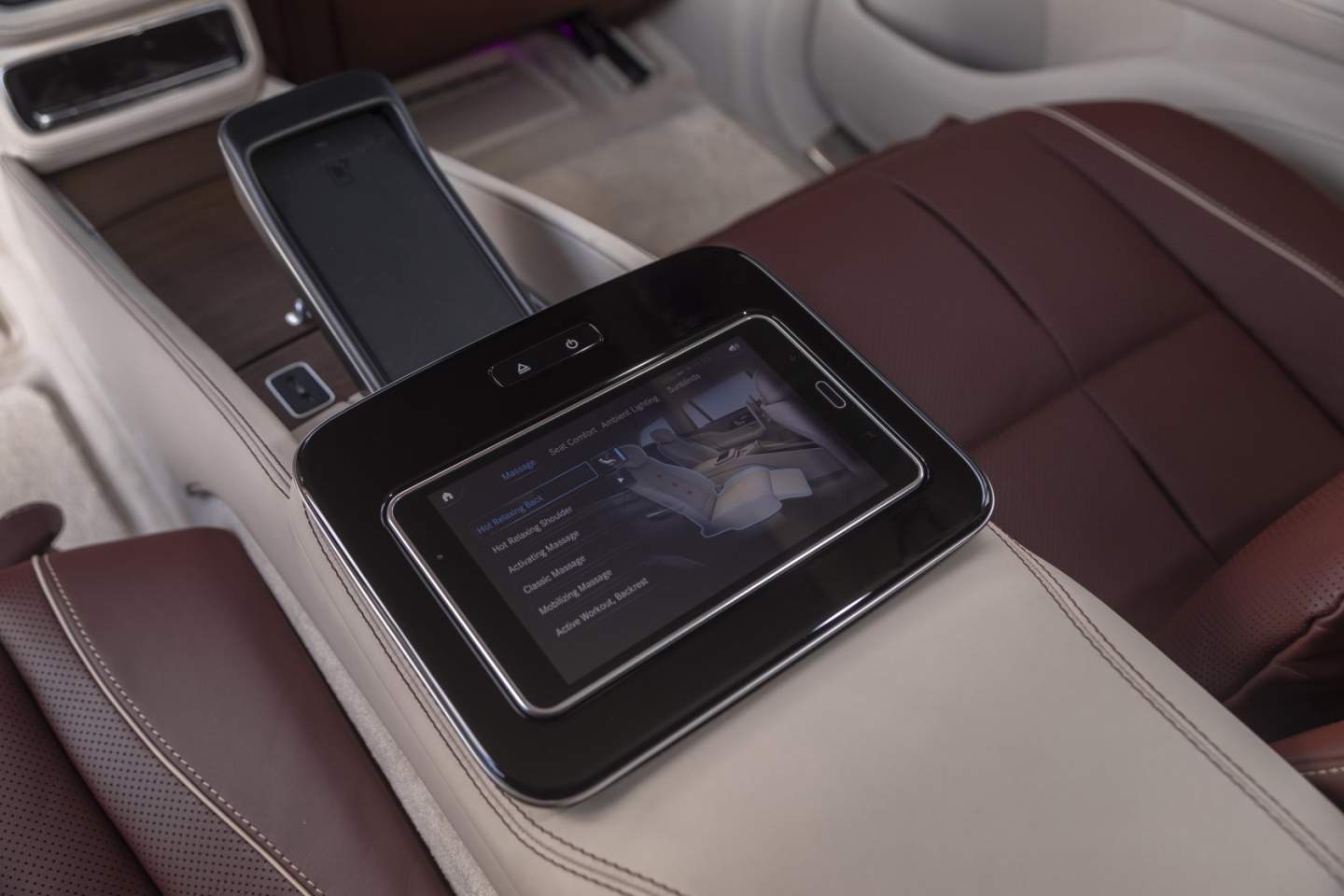 Rear seat passengers get a removable tablet in their center console, from which a broad subset of the MBUX infotainment options are available for remote control. If they want the champagne fridge that's $1,100, however. The folding rear tables are $1,800, and the rear seat entertainment system clocks in at over $2,500. A set of Maybach champagne flutes is $800.