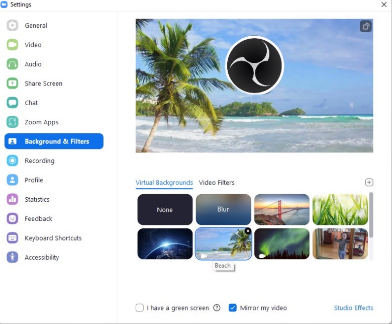 The user could also enter Settings normally – since it's through the app's standard Settings that Virtual Backgrounds are accessed. In Settings, the user will select Virtual Background. In Virtual Background, the user can select one of the few pre-set options, or tap the little "+" icon to add an image or video.