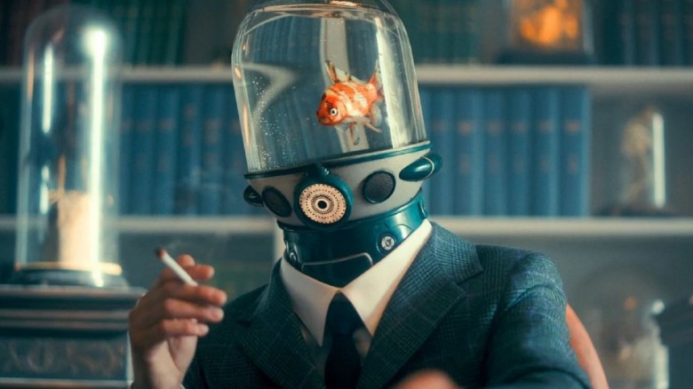 In the video, the goldfish is shown completing one of the tests the scientists created for training purposes. We get to see the fish-operated vehicle in its full glory, and in all fairness, it's not that impressive. It's essentially a square-shaped tank filled with water for the fish to remain safe as it drives, and it's attached to a set of wheels combined with the technology that makes driving it possible. The whole thing kind of resembles the character of AJ Carmichael from "The Umbrella Academy" who has a high-tech fish tank for a head. The FOV moves from one side of the room to the next, clearly aiming for the pink sign that hangs on one of the walls. This, too, is part of the training the fish had gone through up until that point.