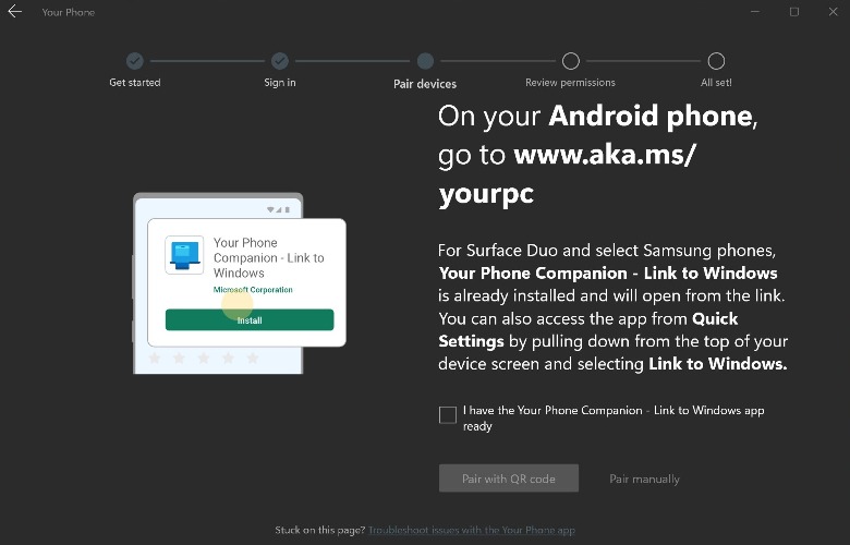 "Your Phone" must also be installed on your PC; it can be found by opening the Microsoft Store app in Windows, typing "Your Phone" into the search field, and then tapping "Get" to install the software. Once the installation is finished, there's one more step to get your PC ready: type "www.aka.ms/addcomputer" into your PC's browser and, once the website loads, click "OK" on the prompt asking whether you want to open the "Your Phone" app.