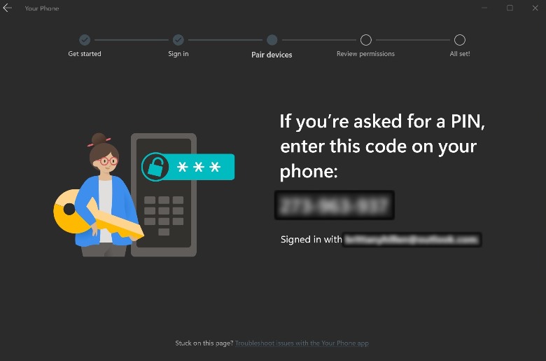 1. Open "Your Phone" on the Android device. In the prompt that appears, you'll see a text field that says "Input the code shown on PC." Type in the PIN presented on the PC.