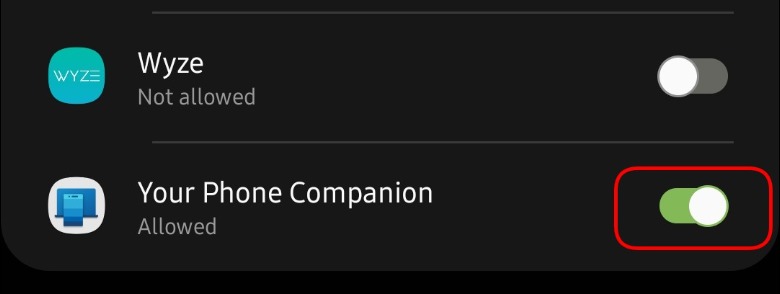Turn on your Android device and sign in if necessary using the password, PIN, or fingerprint. Once signed in, you'll be presented with the "Notification access" menu; scroll down the list of apps until you find "Your Phone," then tap the toggle switch to the right of it to enable notification syncing. You'll see a message pop up — it warns that by turning on the feature, you're allowing "Your Phone" on the PC to get app notifications and more. Tap "Allow."