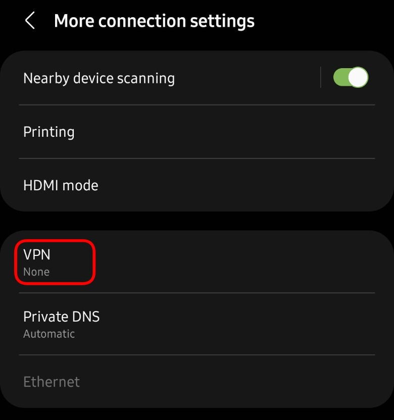 2. Within your device's Connections menu, look for a sub-menu item labeled "VPN" or "Virtual Private Network." Tap on the item to open the built-in Android client.