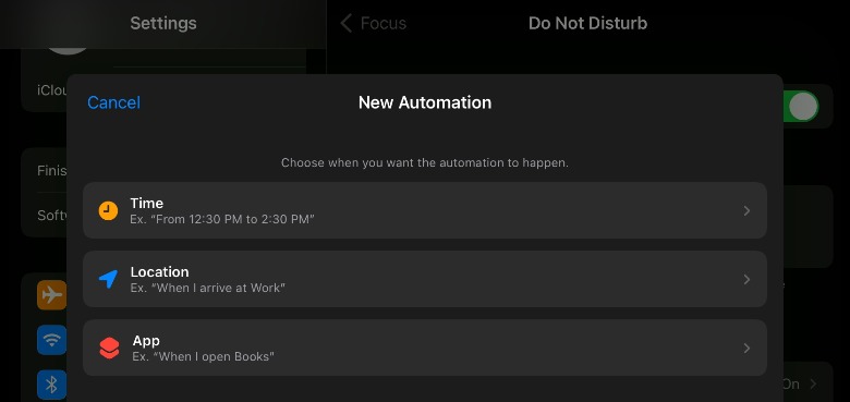 The customization features are found within the same Settings menu where Do Not Disturb can be turned on and off. However, the appearance and exact settings available in this iPhone menu will vary depending on whether you're running iOS 15 or an older version of the operating system. As shown in the image below, iOS 15 includes automations for Do Not Disturb, which makes it possible to, for example, have your iPhone (and iPad) automatically silence notifications when you arrive at work, the library, or when you open your favorite reading app.