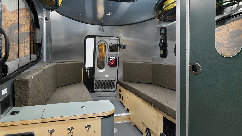 The 16-foot Basecamp camper has a modular dining and lounge area that converts into a 76-inch by 76-inch bed to sleep two adults. Other neat features include a multi-layered green slate countertop, exposed birch plywood, a two-burner stove, a stainless steel sink, and a graphite black faucet. Furthermore, the Airstream X-Package adds more rugged features like a three-inch lift kit, custom aluminum wheels wrapped in knobby off-road tires, stainless steel stone guards, and a front window cover to protect against harsh UV rays.