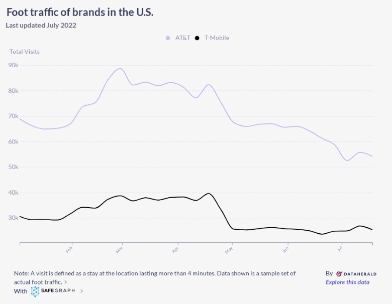 T-Mobile is the second most popular cell phone carrier in the U.S. in terms of raw subscriber numbers; it's behind Verizon, and ahead of close rival AT&T. Despite this, T-Mobile has been dominating first-place Verizon in terms of in-store foot traffic. Oddly, this trend continues when T-Mobile is compared to the company in third place: AT&T gets more potential customers through the door than T-Mobile. In addition to telling us which company managed to lure the most people through its doors, the information MMtech Online has received from DataHerald tells a deeper story — it actually highlights more parallels between the companies than differences and could also highlight wider trends in the industry.