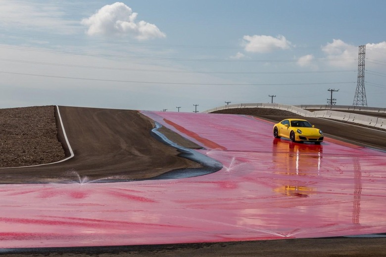 Porsche doesn't make it easy on you. The low-friction course's already glass-like surface is thoroughly wetted-down, and then you're expected to navigate several tight turns while remaining somewhat in control. It's imperative to remain calm, be quick to react, and yet smooth with your steering inputs; once you've mastered that, it's possible to use the gas to help steer the car.