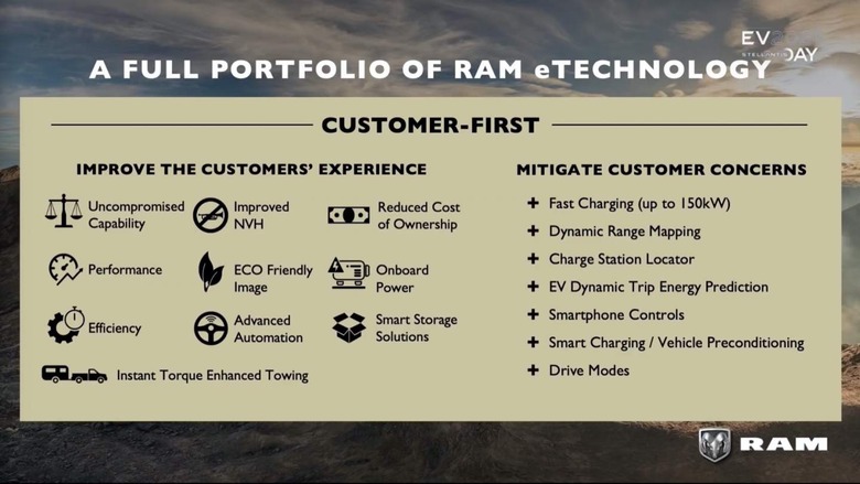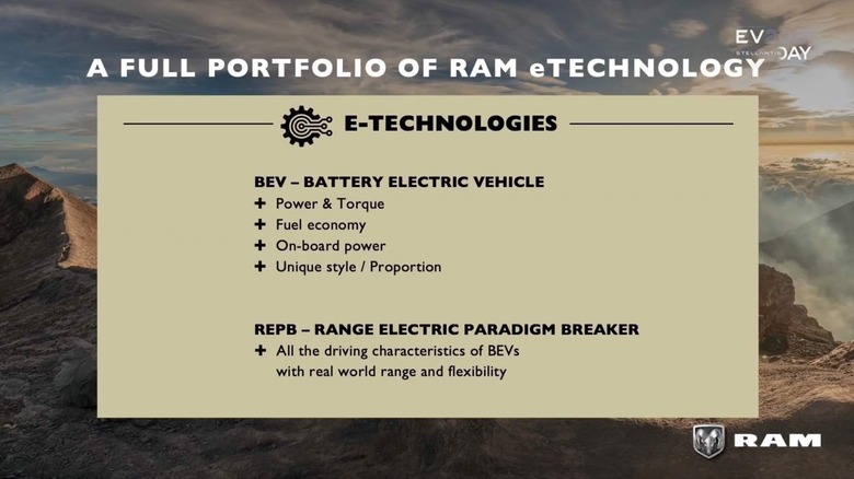 Helping bridge the gap will be what Ram is calling "REPB," or "Range Electric Paradigm Breaker." That, the automaker says somewhat vaguely, will support "all the driving characteristics of BEVs with real world range and flexibility." It sounds a lot like a plug-in hybrid of some sort, which we've seen Ford do to good effect with the F-150 PowerBoost Hybrid.