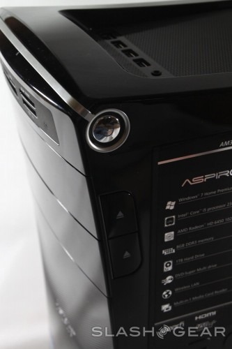 Aesthetics are secondary for a standard desktop, but as they go, the AM3970 is decent. A steel chassis is surrounded by glossy black panels on the front and top, with only two subtle blue LEDs for power and drive status – a plus in my book. The power button is placed oddly on the upper left corner of the right side, making seeing and using it tricky if you place your computer on the floor or to the right of your monitor. On the floor is certainly where it's intended to be, with four USB ports plus a headphone jack and line in on the top of the computer. The eject button is also on the right side, implying that the computer is intended to be beside or below the user's desk and to the left, and leaving little choice otherwise. Once placed there, using the SD/MicroSD/Compact Flash/XD/Memory Stick card reader becomes a chore, thanks to the black-on-black inlaid slots.