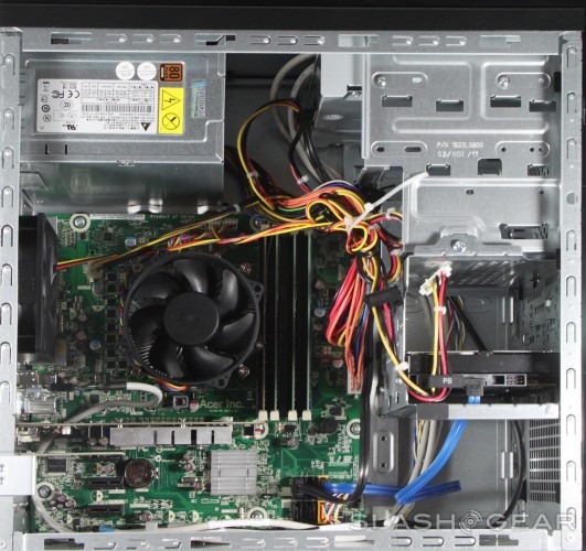 Moving on to internals, the AM3970 comes with a 3.0Ghz Core i5 2320 CPU, 8GB of DDR3 memory (2x4 DIMMs) and a 1TB traditional hard drive. When compared to similarly priced desktop models from Dell and HP, Acer gives you identical components with an extra 2GB of memory. Along for the ride are a standard DVD-RW drive and a discrete AMD Radeon HD 6450 graphics card. Popping the access panel off requires a screwdriver (no thumbscrews) and while pre-built desktops like this one aren't often made with expansion in mind, a reinforced back panel and a decent amount of room inside should make that easy enough for those who want to upgrade components later on.
