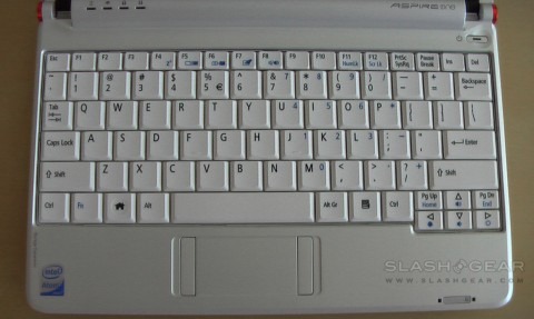 It's a real shame, because the Aspire One keyboard is a surprising pleasure to type on. Personally I may be a little biased, as my daily-driver is a Sony VAIO TZ, but others who have tried the Acer have had little difficulty acclimatizing to its compact keys. Key travel is 1.6mm; less, certainly, than full-sized notebooks but comfortable enough overall. And of course, there are three USB ports for plugging in keyboards and mice if larger peripherals are needed.