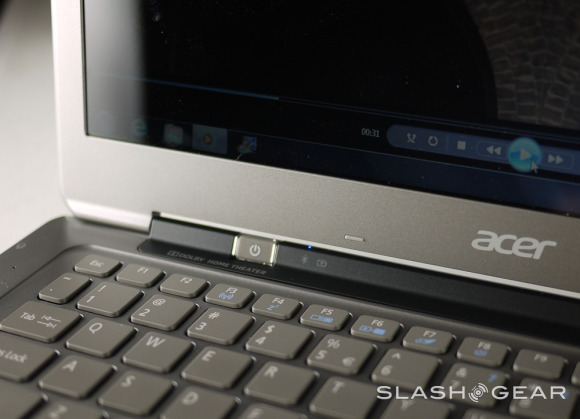 One of the most awesome bits in this machine's bag of tricks is the Instant-On technology Acer is employing, this allowing you to pop your machine open and have it up and running in 2 seconds. The real magic here is when you close the notebook though, as once you've closed the machine it goes to one level of sleep, then after 8 hours it goes into a much deeper sleep which will preserve the battery for a total of 50 days — we've not had the machine for quite that long, so I'll report in on that once the battery dies. Thus far we've seen this machine play video for 4 hours straight before dying, and with basic functions like typing and web browsing we're seeing closer to 6.