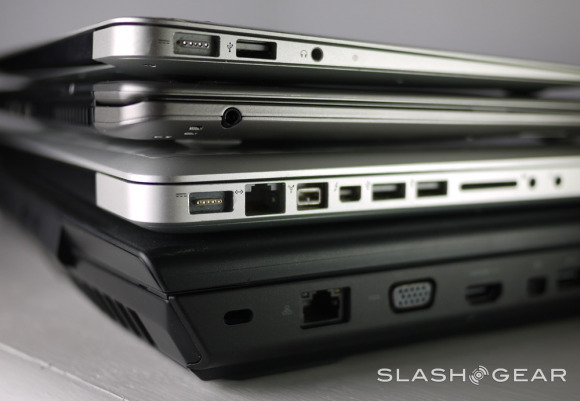 Inside you've got Bluetooth 4.0, the multi-gesture touchpad is precise and makes for an easy to control experience all around, and the webcam is alright – good enough for video chat certainly. You've got 3.86 GB DDR3 SDRAM at 666MHz controlled by your HD 3000 graphics control unit, and a partridge in a pear tree. And that's just the hardware. The whole thing looks rather nice too, if you don't mind the similarities to the rest of the ultra-thin super-powered notebook competition out there. Take a peek at this tower of laptops to see the difference between the units your humble narrator has been using lately – up top you've got an 11-inch MacBook Air, next the Acer Aspire S3, a MacBook Pro 15-inch, and a gigantic mother of an Alienware gaming notebook M17xR3 complete with lots o' lights – each of these units has a different purpose, and the size shows their power here, as it were – note that the MacBook air is from a few years ago so isn't as pumped up as the line is today, and you can check the Alienware machine in action back at Arkham City.