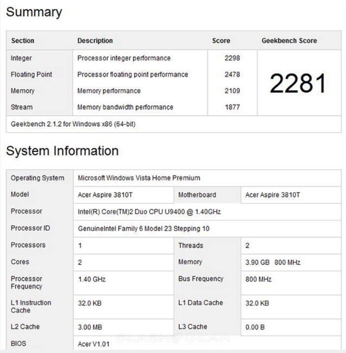 Performance won't light any fires, with the 1.4GHz Intel Core 2 Duo SU9400 and 2GB of DDR3 memory primed for prolonging runtime rather than heavy crunching, but the Timeline is still capable of multitasking with a few browser windows and an Office document or two open. It scores fairly well on GeekBench 64-bit with total score of 2281, comparable to Lenovo T400s (2864).This isn't the machine for graphically intensive tasks, however, as the integrated Intel GMA 4500MHD falls short of anything approaching reasonable gaming performance. Still, the 500GB hard-drive is impressively capacious, and goes some way to making up for the absence of any sort of optical drive.