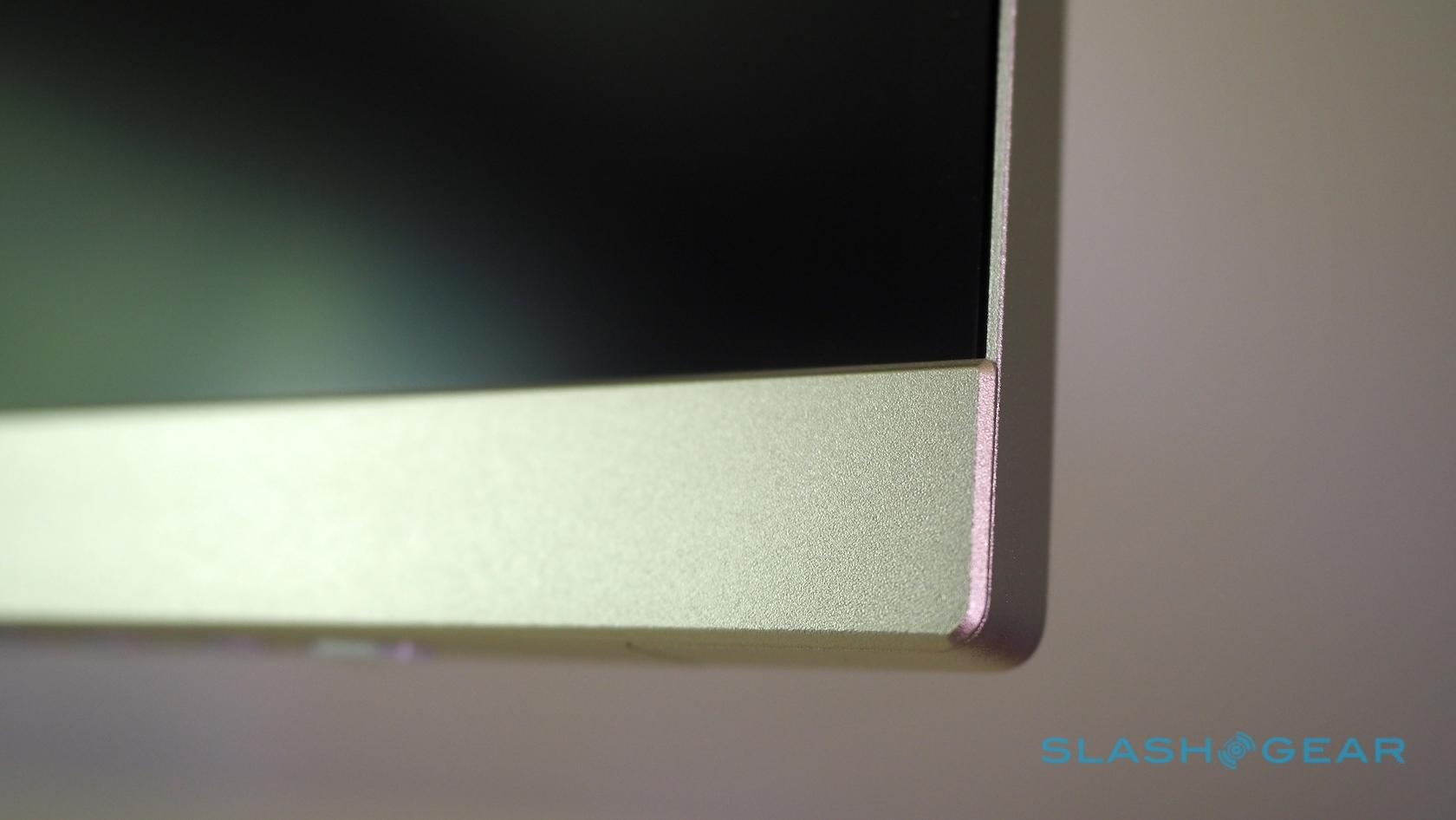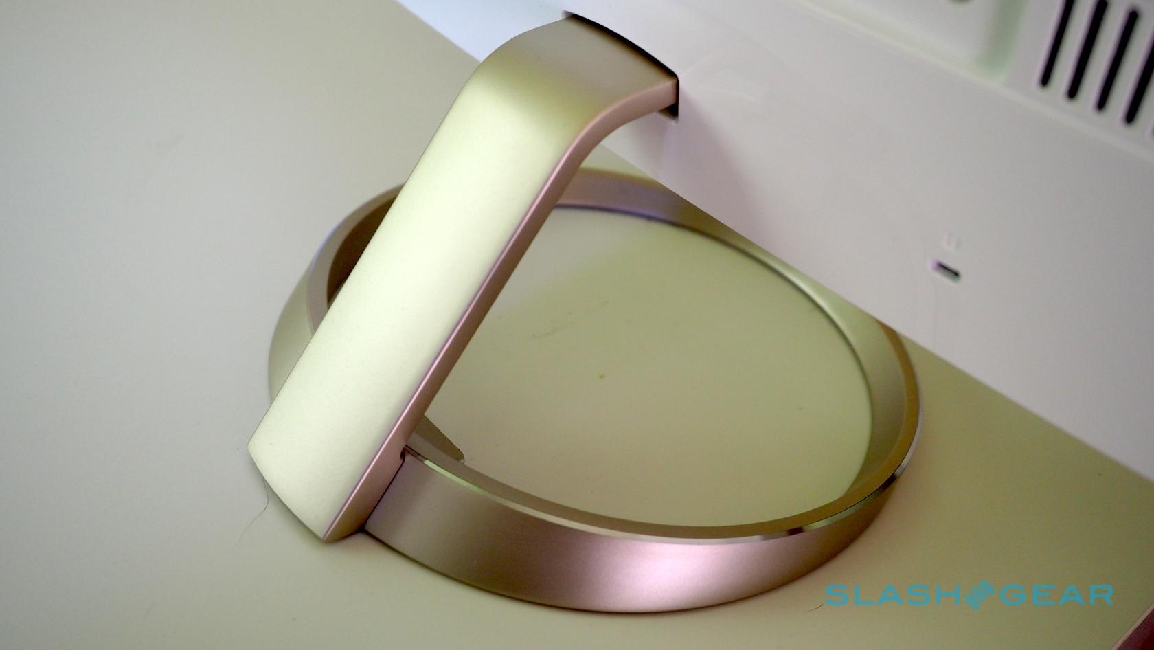 The monitor looks the part, from the front at least. The bezels and stand are gold-color anodized metal (it's actually magnetized, so paperclips will cling to it); only the glossy white plastic back makes it clear this isn't actually an Apple product, and bely the RRP.