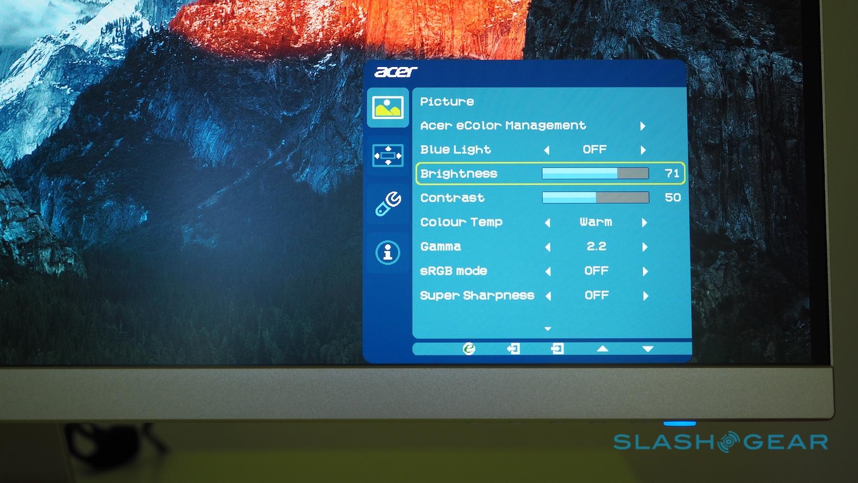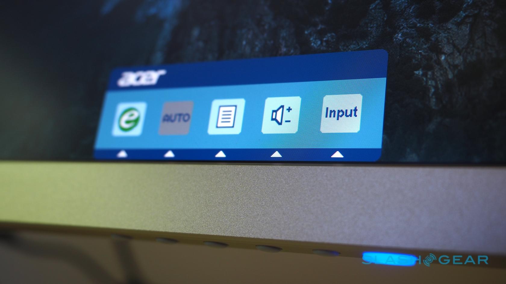 Control is via a row of buttons along the bottom right edge of the monitor: tap one, and the on-screen dialog pops up to adjust brightness and color settings, switch sources, and change the volume. You're not going to mistake the UI for that of a recent smart TV – it's very basic, even if Acer actually offers an impressive range of adjustments including 6-axis Hue and Saturate tweaking – but it does the job.