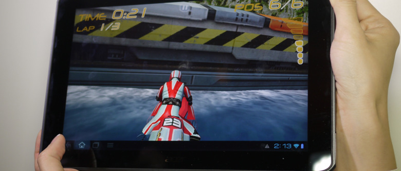 This device has been previously leaked just last month, and all of the specs appear to have stuck: a gigantic 9,800 mAh battery, back-facing 5 megapixel camera, micro USB and microHDMI ports under the lovely little cover on the side, power port near the power button on the left-top, and a cool stylized back. This looks to be a definite step up in all categories compared to Acer's last effort, especially int he display department, but twice as nice with both Ice Cream Sandwich and quad core under the hood. Lookin good, Acer!