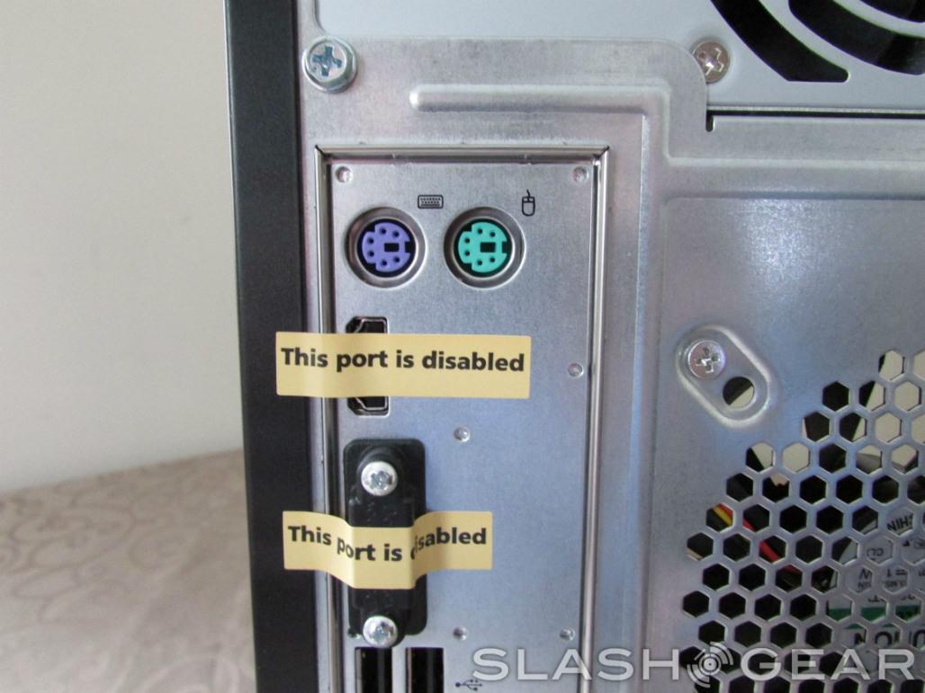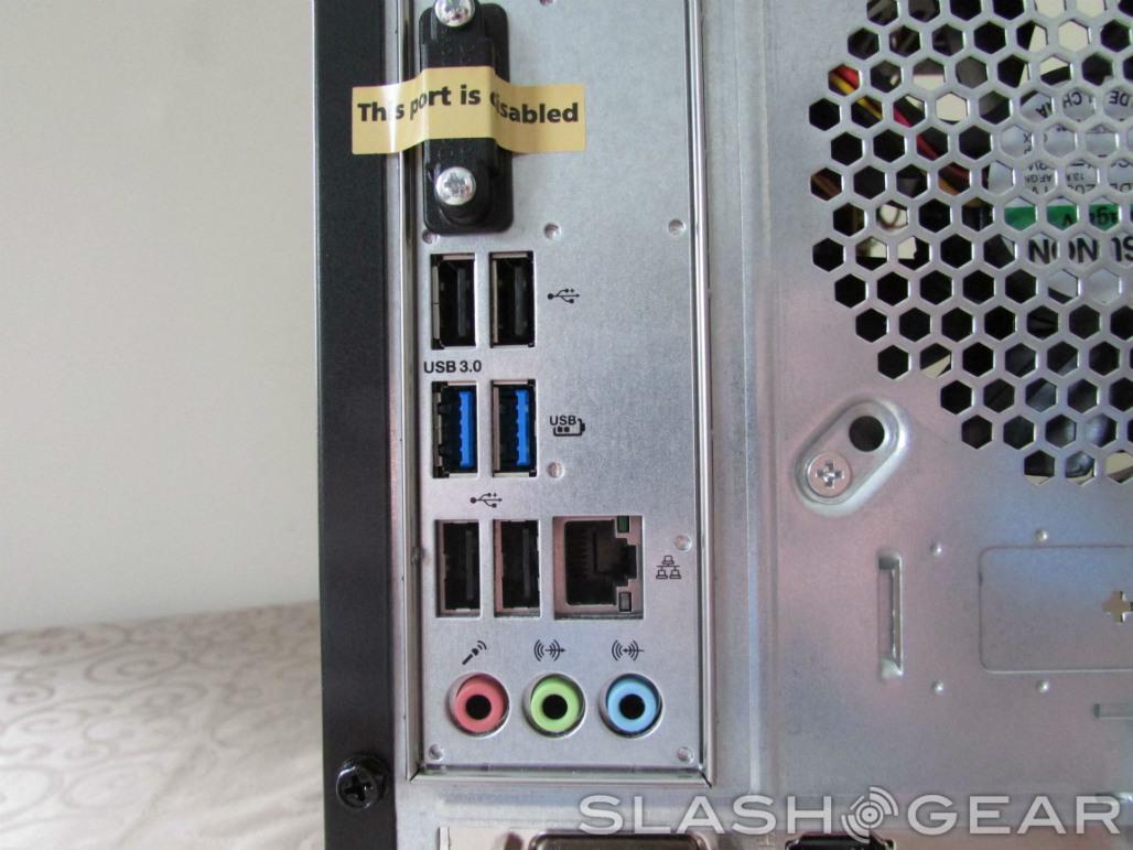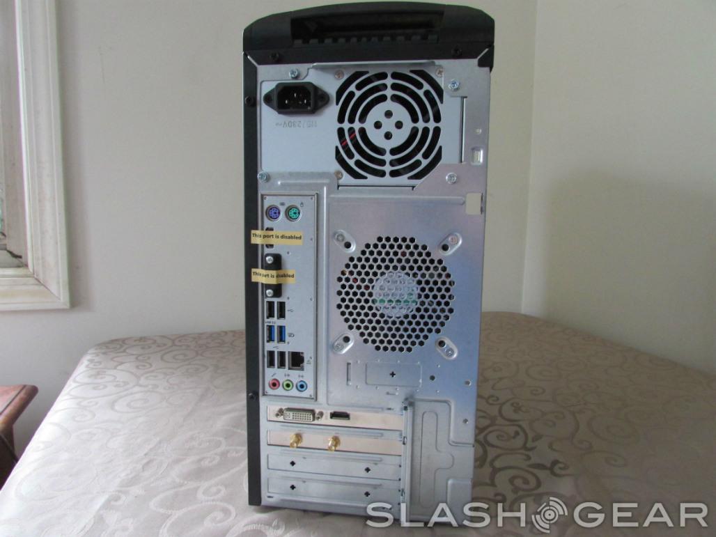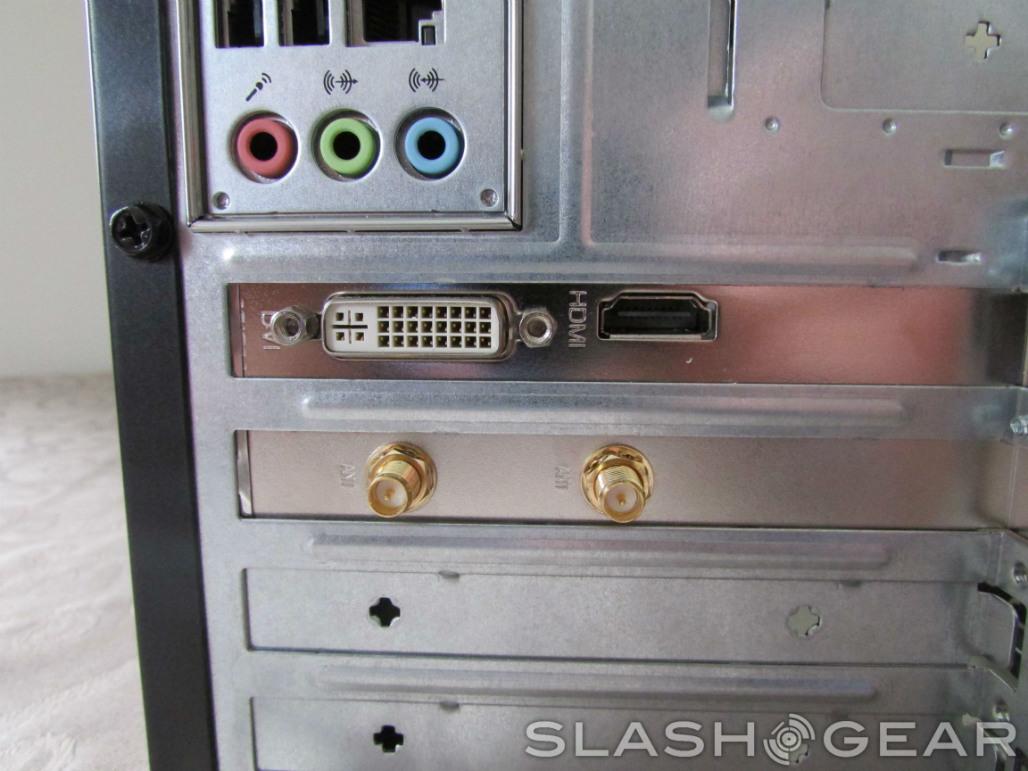 Around the back, you'll find more USB ports. There are six additional USB ports, to be exact, with four more USB 2.0 and two more USB 3.0. There's also VGA and DVI ports, along with two HDMI ports. You've got the standard audio jacks underneath the additional USB ports, jacks for a mouse and keyboard, and an RJ-45 port for 10/100/1000 Gigabit LAN.