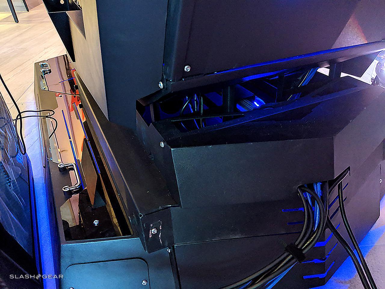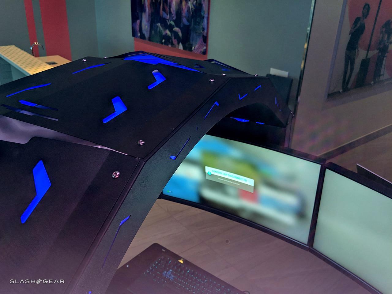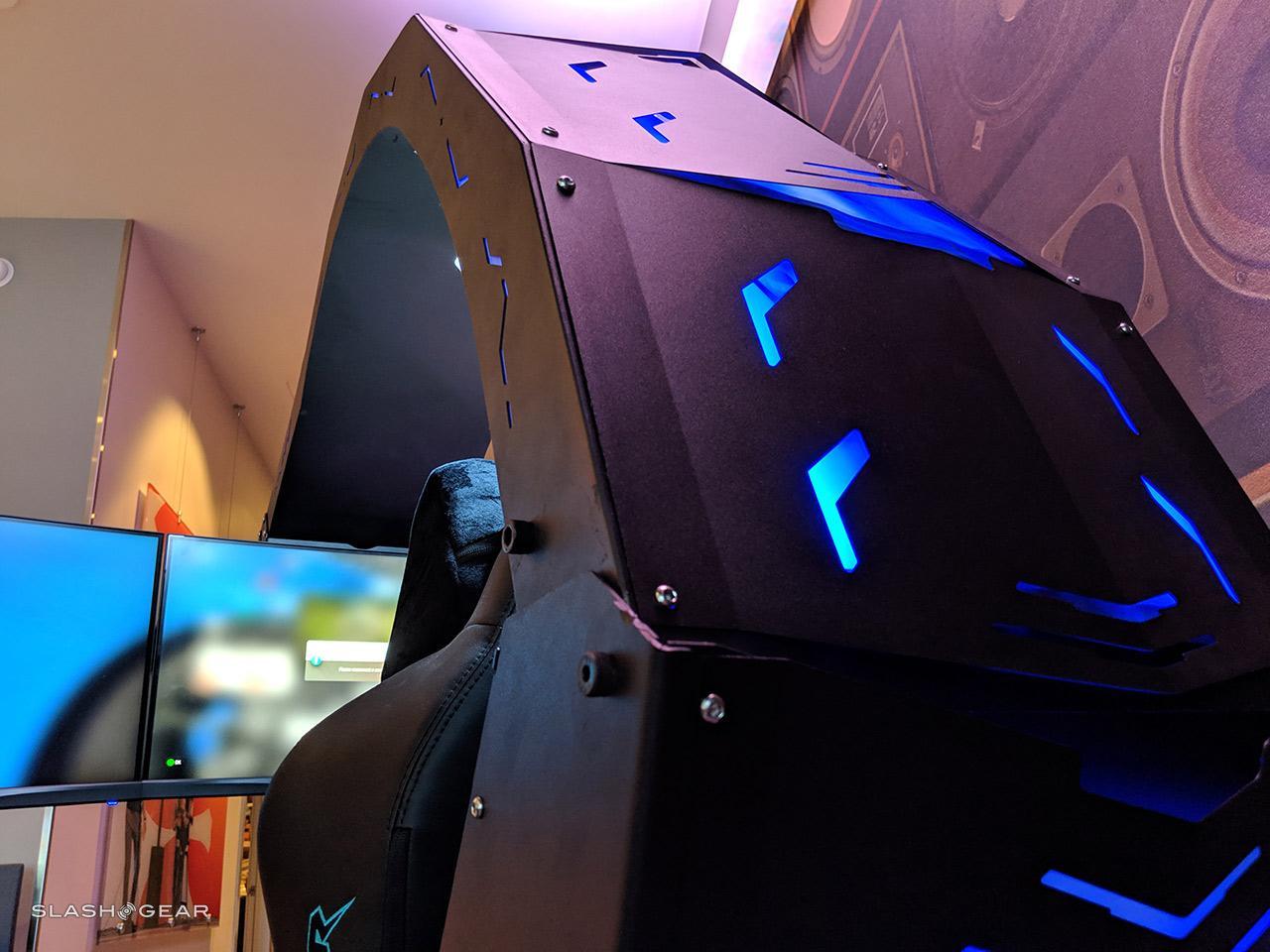 This gaming chair is the embodiment of excess – it's a beastly extension of a hardcore gamer's dreams, the most extravagant accessory ever made. You have a super-powerful gaming PC, here, and the gaming chair right next to it. It's a chair, with displays, with speakers, with everything you can imagine you might want in a singular all-encompassing game system for the seated, immersed gamer. This chair is everything short of actually floating in the center of a spherical display – maybe next year.