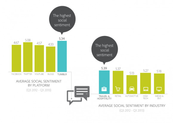 Another insight that could be important for social advertisers–not to mention investors–is that Twitter was ranked second only to Tumblr in terms of "mentions" of other users. That means users speak directly to other individual users, rather than "broadcasting" to the anonymous masses. The more engagement there is, the faster a brand name can spread. Twitter scored higher than YouTube, Facebook and blogs on this metric. Adobe calls this metric "social sentiment".