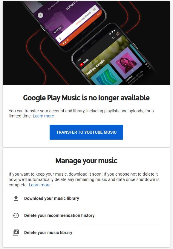 As spotted by Android Police, Google has starting showing notifications saying "Google Play Music is no longer available" in both the app and on the GPM website. In the mobile app, users are prompted to transfer over to YouTube Music, while the website gives users prompts to download their music libraries, delete their recommendation histories, and then delete their music libraries from Google's servers.