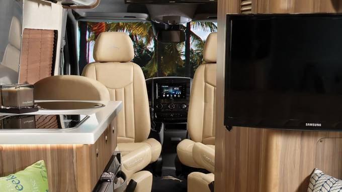 The island coach is also equipped with premium leather seats, a tankless water heater, genuine Corian countertops, a 16,000 BTU furnace, and a powerful 13,500 BTU air conditioning system. It also has a built-in 2.5 kW generator to juice up the van's standard appliances and accessories. In short, it's the ideal steed for your #VanLife regimen.