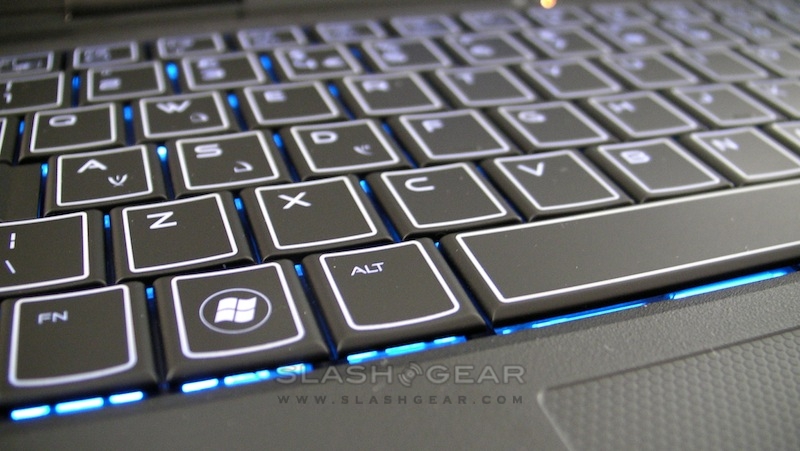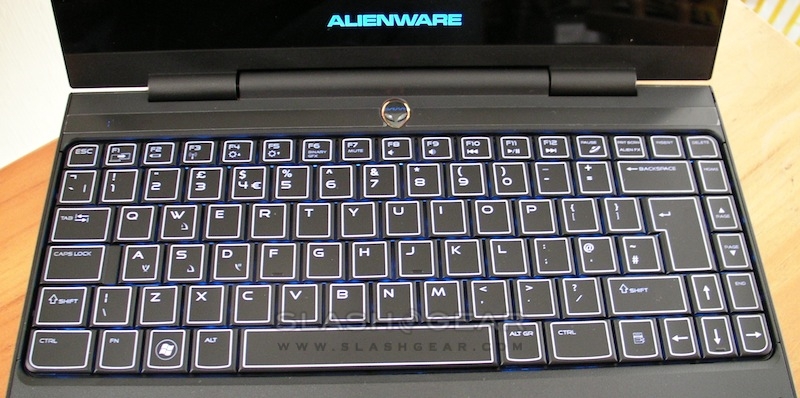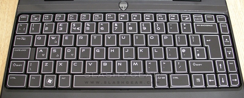 Build quality is high, though the M11x is a real fingerprint magnet. The "Cosmic Black" casing is sturdy, but it's the high-gloss display which is already proving tricky to keep smear-free. We wouldn't argue with a little extra brightness at its maximum setting, either. The keyboard – like several other parts of the notebook – is LED backlit and there's a preloaded app which you can use to cycle through various colors; more importantly it has above-average travel and doesn't feel mushy. No room for a separate numeric keypad, but Alienware do slap their trademark glyphs across the standard gaming keys.