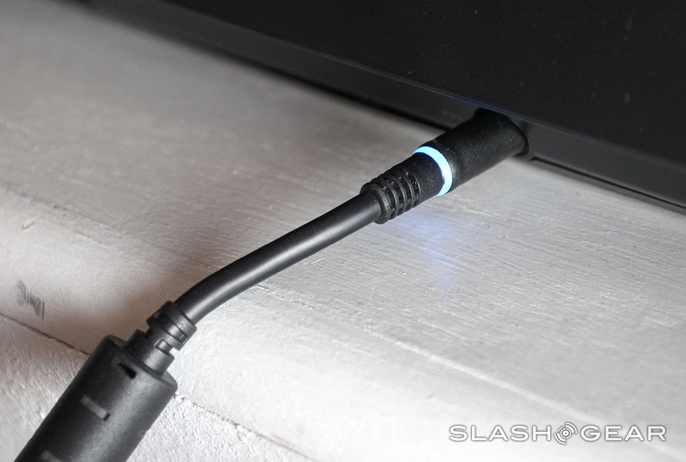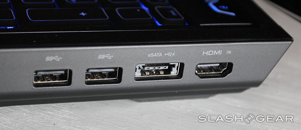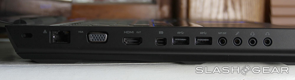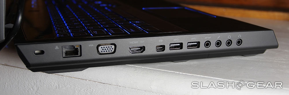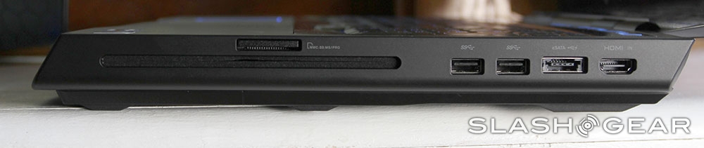 On the sides you've got a massive amount of ports, with a VGA port, HDMI-out, HDMI-in, two USB 3.0 ports, headphone, headset, and microphone jacks, eSATA/USB port, Mini DisplayPort, and Gigabit ethernet port. That big slot on the right is ready to roll with Blu-ray, you've got a multi-format card reader, and on the back you've got a power port that's certainly not made to be used on the go. The power cord falls out all the time with just a tug. The plus side of this is that it's just fine if you'd rather have a tiny cord fall down on your child's head than the whole massive hunk that would otherwise come with it.