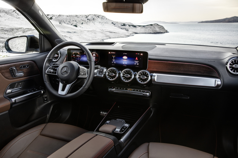 The GLB's interior is typical Mercedes-Benz. With three round center vents, a widescreen cockpit to control the standard MBUX multimedia system, and an aluminum off-road tubular element in the lower section of the instrument panel, it makes you feel like sitting inside a smaller G-Class. The GLB gets a 7-inch digital instrument cluster and 7" touchscreen display with Apple CarPlay and Android Auto.