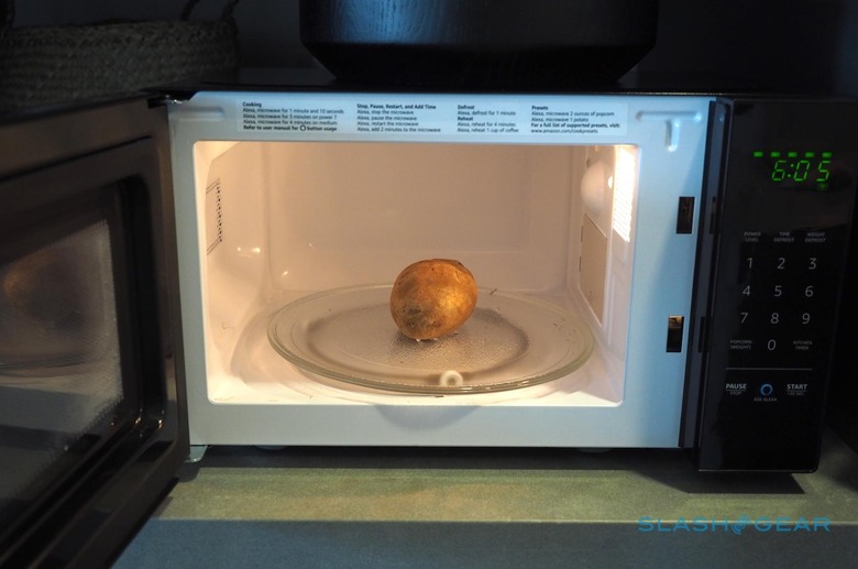 "Microwaving one potato," Alexa informed me, cheerily, "six minutes and thirty-four seconds." I cancelled the whole thing a few seconds later, with a simple "Alexa, stop the microwave," command.