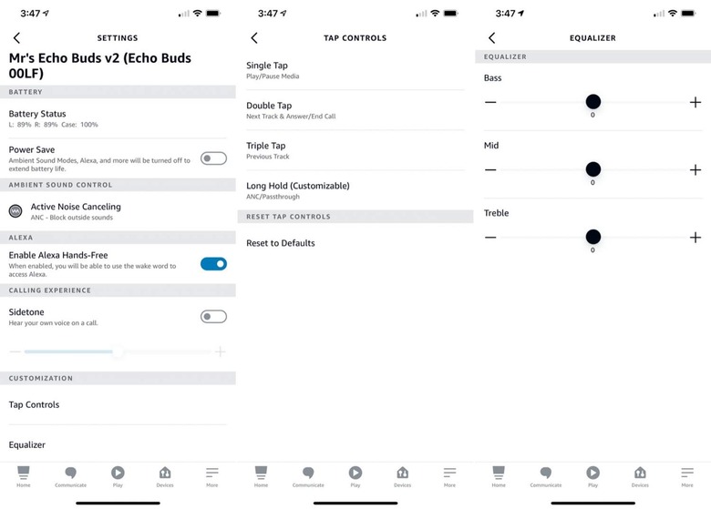 Pop an earbud out mid-listen, and the music will pause until you put it back in. They'll also work in mono mode. A single tap on either earbud toggles play/pause manually, a double-tap skips forward, and a triple-tap skips back. You can reprogram the long-press from ANC/passthrough, to volume up or down, manually triggering Alexa, muting/unmuting the microphone, or summoning Siri or the Google Assistant on your phone. It's also possible to set a different long-press shortcut for each earbud.