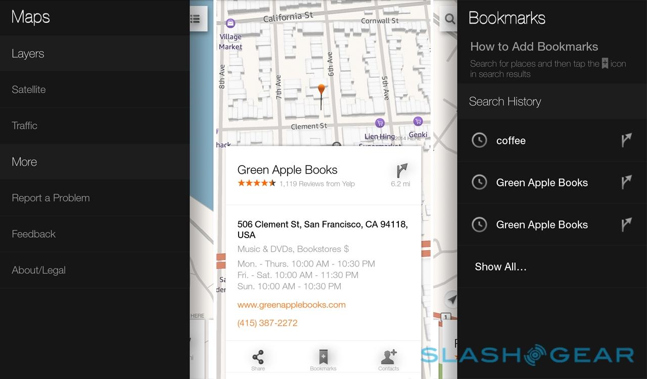 Elsewhere, though, the options vary by the tasks you're trying to carry out. In the maps app, for instance, flicking left or right shows layers and bookmarks; in the Kindle app, you get options to sort the library differently, toggle between content saved locally and that in the cloud, and recommendations for what to read next.