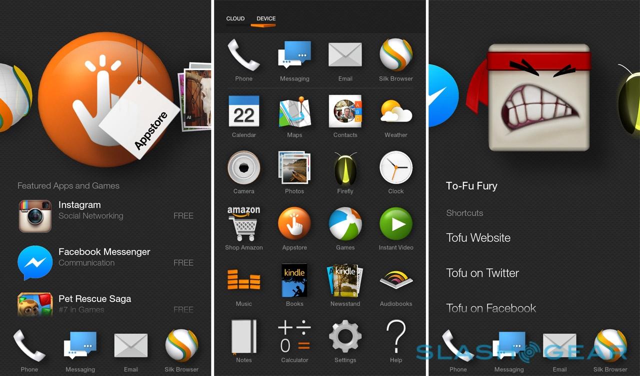 They're replaced with Amazon's own versions and alternatives, just as on the Kindle Fire HDX tablets. Your most common port of call is the Amazon Appstore, the retailer's download store which is currently stocked with around 185,000 titles. Developers have to submit their wares separately, though little changed from the regular Play versions, but unlike Google, Amazon puts each through a vetting program to make sure nothing nefarious gets through to users.