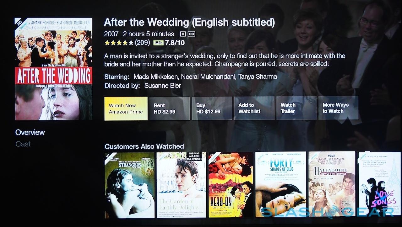 Playback can be started on Fire TV itself, or using the Second Screen feature on Kindle Fire HDX. You also get X-Ray for pulling up IMDB-based show content on your tablet while you watch, synchronized to the current point in the show; Amazon says that'll be added to iOS and Android later in the year.