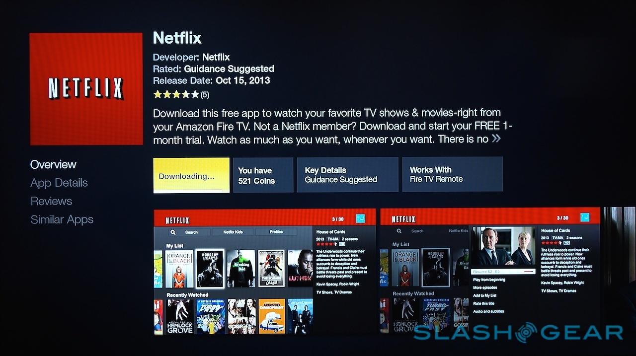 Freshly set-up, Fire TV is clearly an Amazon-centric product. While there are apps for Hulu Plus, Netflix, and others out there, you'll need to manually install them from the appstore, and then punch in your login credentials. Given Fire TV is already linked to your account, we found ourselves wishing we could do all that online through the browser, and have sign-in information pushed straight to the box.