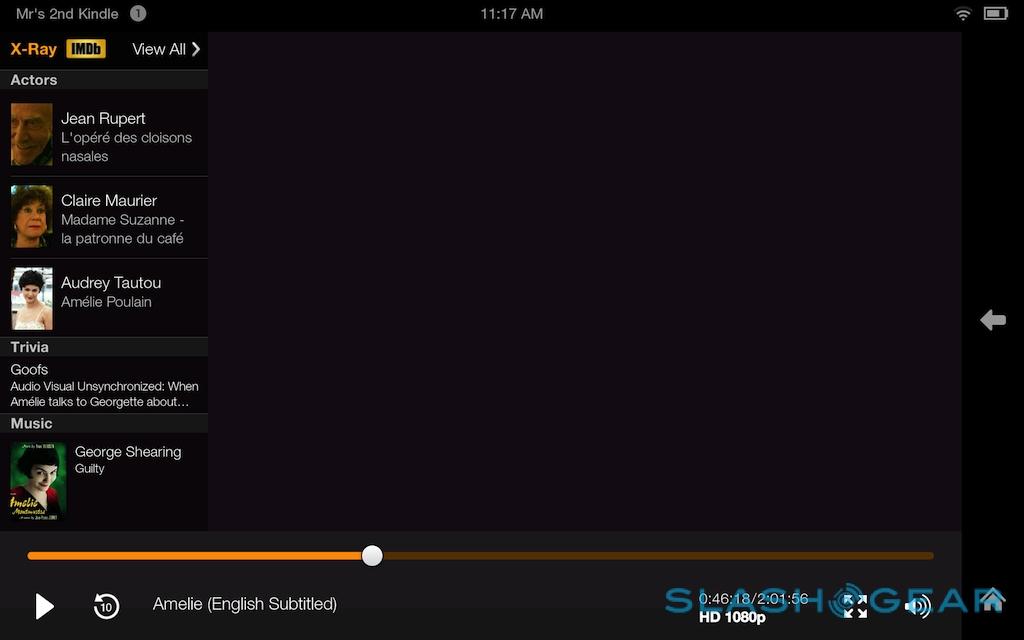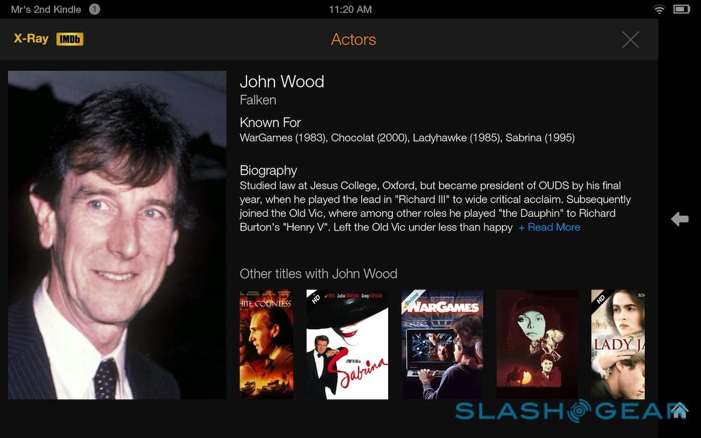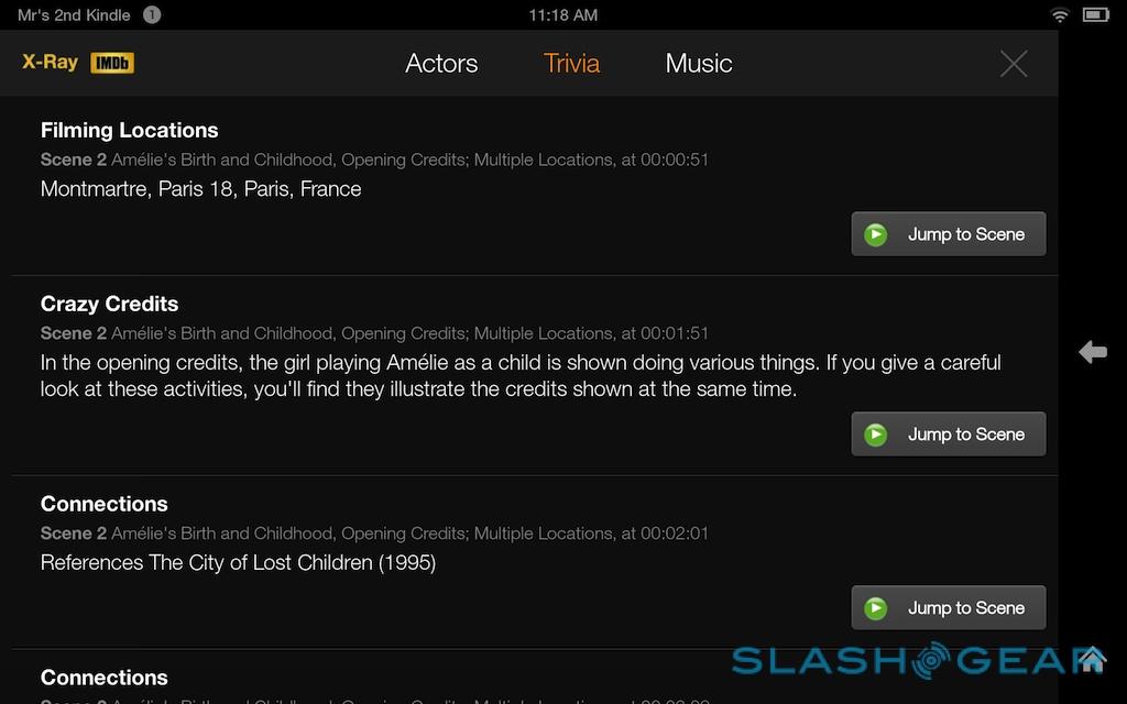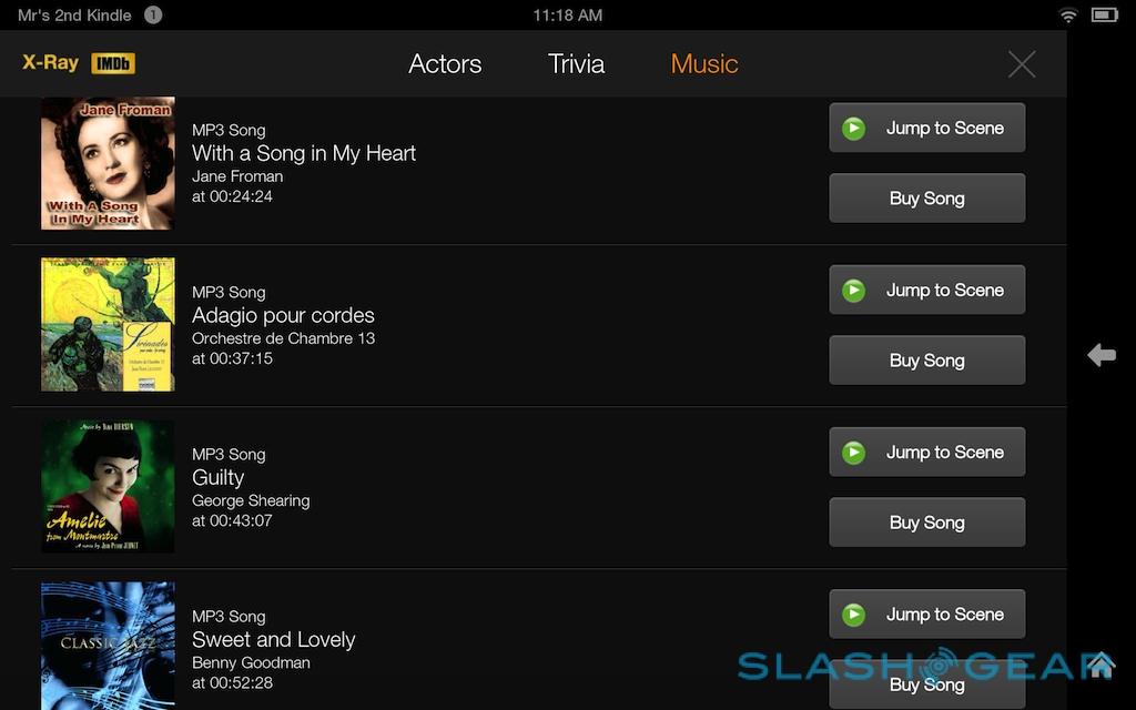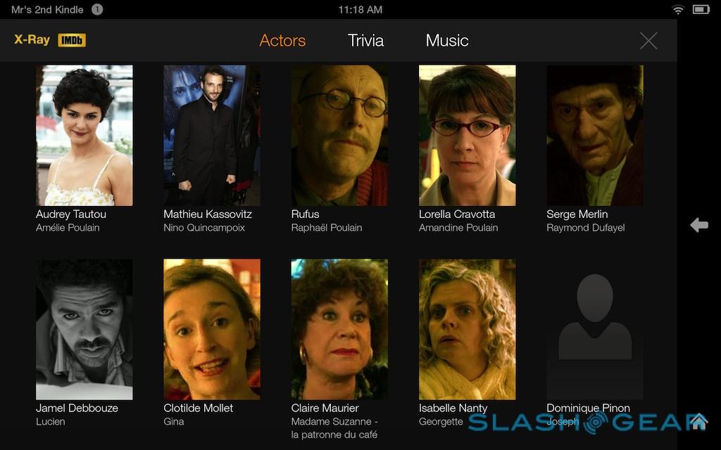 Amazon launched X-Ray for Movies and TV roughly a year ago, and it gets a revamp on the Fire HDX along with a new X-Ray for Music service. As before, X-Ray for Movies shows actor biographies and character lists for whichever character is on-screen at the time, pulled in from the IMDB, but now it also flags up what music is playing, along with show trivia. The music system is particularly slick, not only telling you the current track (and allowing you to buy the MP3, of course), but letting you jump between different scenes based on the musical backing.