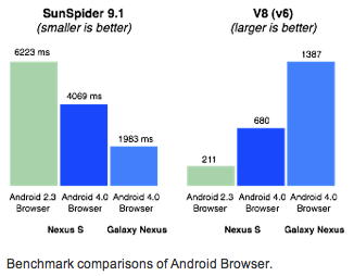 Website preferences can be set separate for each browser tab, and users now have the ability to save entire pages for offline reading. A visual list (with thumbnails) is available for users to see saved pages, browser bookmarks, and history. Users may change how zoomed in to a webpage they are and the default size of text across the web for ideal visualization. Page rendering performance has been improved through updated versions of WebKit core and V8 Crankshaft compilation engine for JavaScript. Benchmarks have been done by Google showing vast improvements switching from the Gingerbread browser to the Ice Cream Sandwich browser on the Nexus S, then another just as dramatic improvement when switching to the Galaxy Nexus, aka the hero phone for ICS: