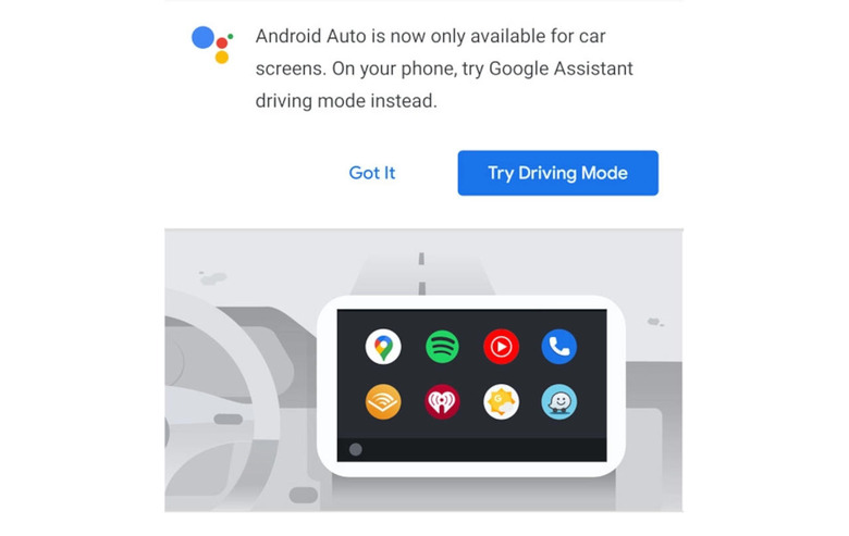 Android Auto was a bit late to the game compared to Apple's CarPlay, and, unsurprisingly, not many car manufacturers were keen on immediately supporting it. As a stopgap measure for those with cars that don't support Android Auto, Google created an app that ran the user interface on a phone that would then be safely perched on a car's dashboard. This Android Auto For Phone Screens app has supposedly served its purpose, and Google wanted to retire it immediately.